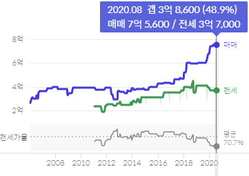 매매가는 2017년 하반기부터 상승세를 타면서 현재 7억을 돌파한 모습입니다.